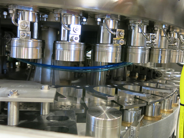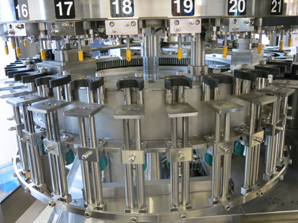 La partie de remplissage est virile et comprend une vanne de remplissage et des pièces de transmission de remplissage. La bouteille lavée atteint la position de remplissage via la roue de changement de bouteille. En attendant, la plaque de serrage de la bouteille de la machine de remplissage va serrer la bouteille et remonter pour sceller la bouteille, la soupape de remplissage va s'ouvrir et envoyer le liquide dans la bouteille.